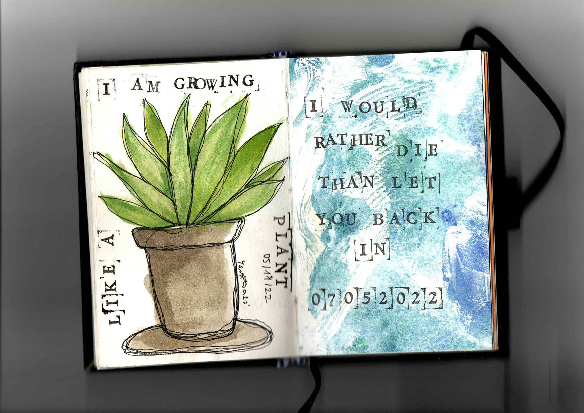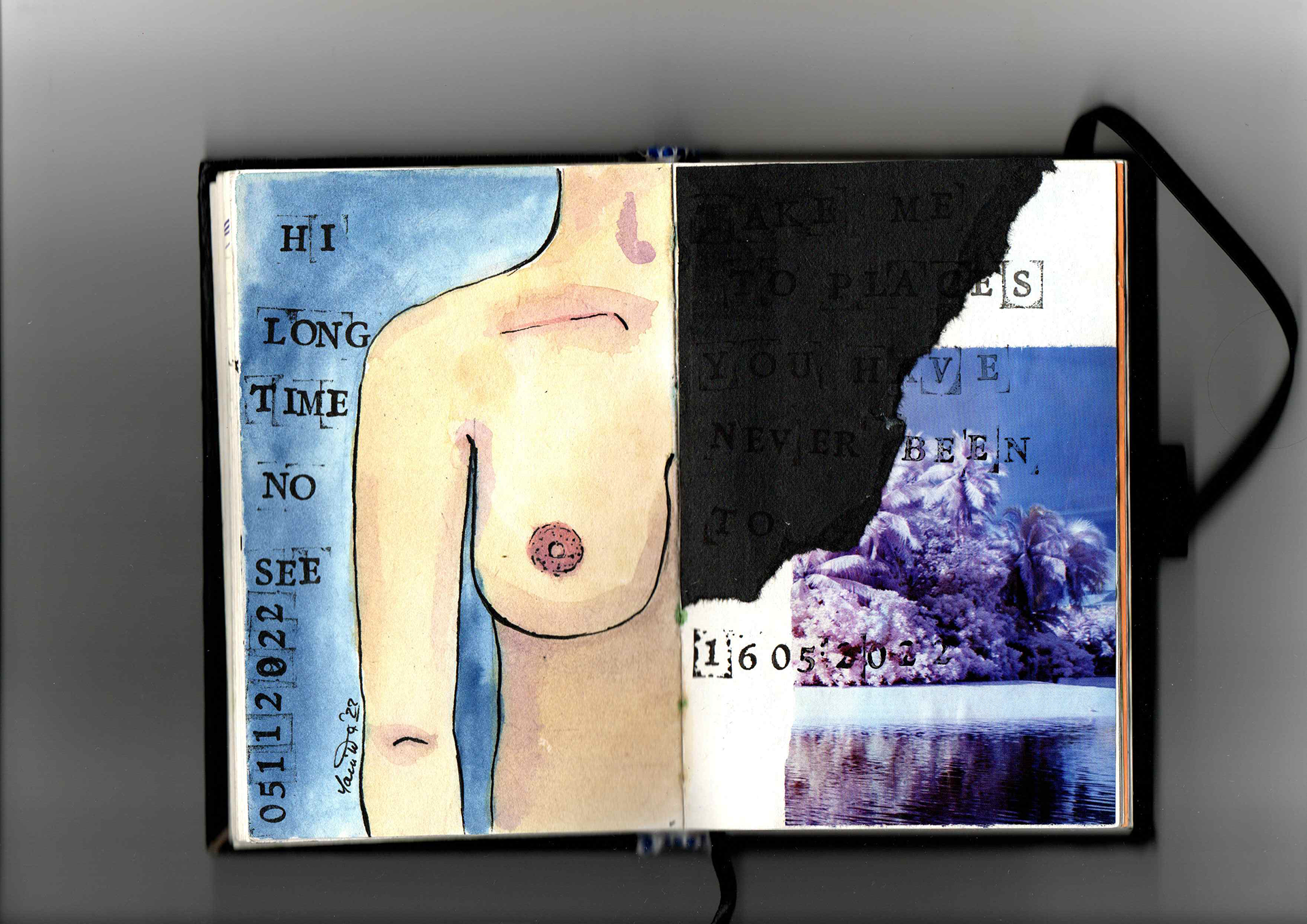 A visual dialogue with the inner self - this collection blends ink, collage, stamps, and watercolor to capture raw, intimate reflections. Each page is a layered conversation, a whispered reminder, or a moment suspended in time.
